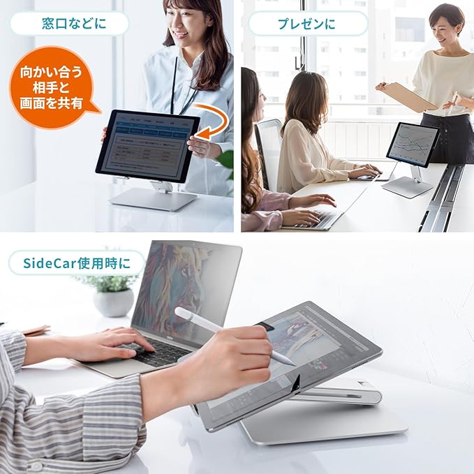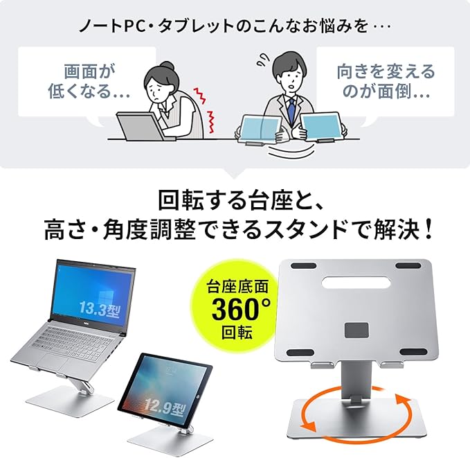 ノートパソコン用のスタンドとして、iPad・タブレットのスタンドして使用できるアルミスタンド。360 回転可能で対面使用にも最適。アーム式で高さや角度を調整可能。放熱効果もあるアルミ素材のタブレットスタンド。