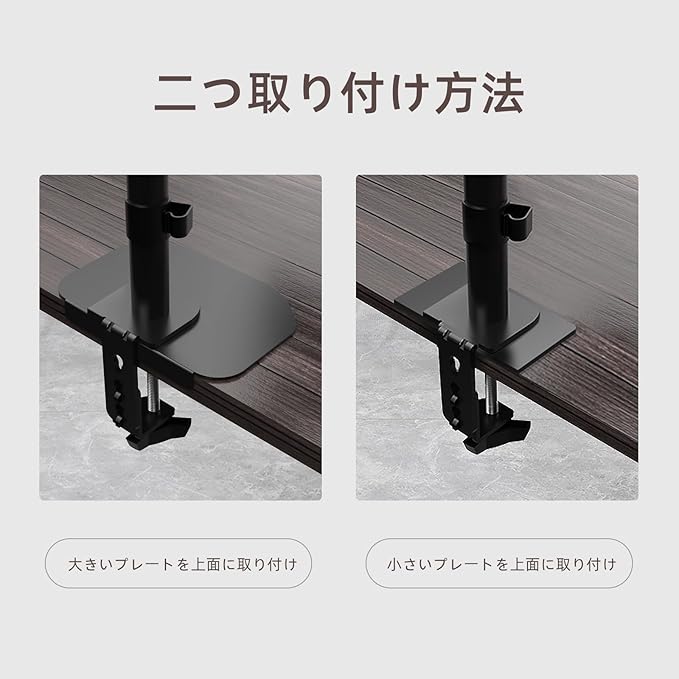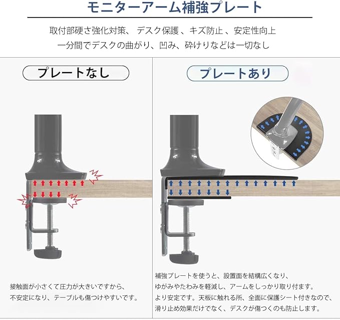 【キズ防止】滑り止めシート付きの大、小補強プレートをモニターアームに増設すると、キズ防止はもちろん、デスク裏面さえ保護できます。