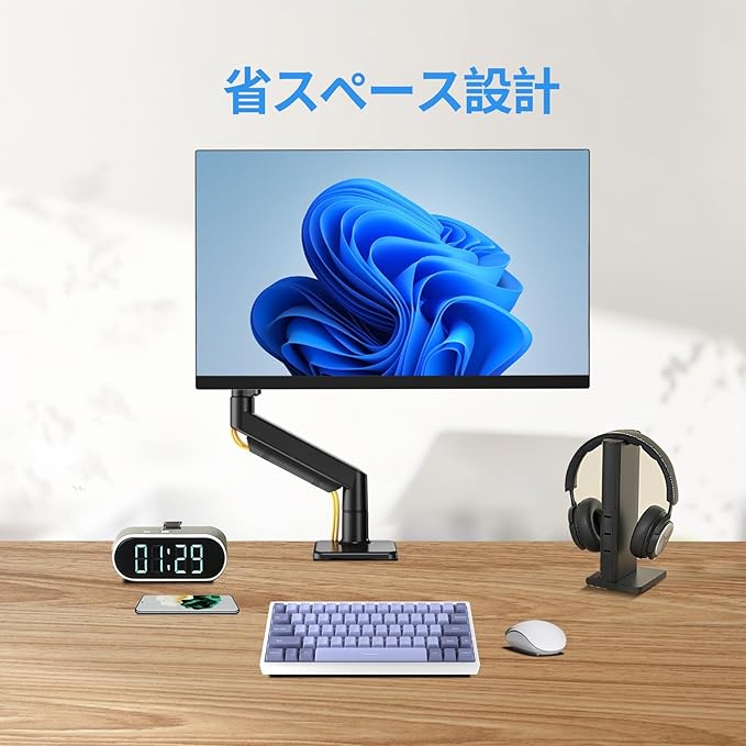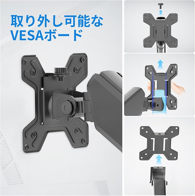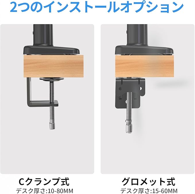 【簡単取り付け】モニターアームは非常に簡単に取り付けられ、パンチホール不要の取り付けに適しています。Cクランプ式でデスクを傷つけず簡単に設置可能。取り外し可能なVESAプレートでモニターの着脱もラクラクです。