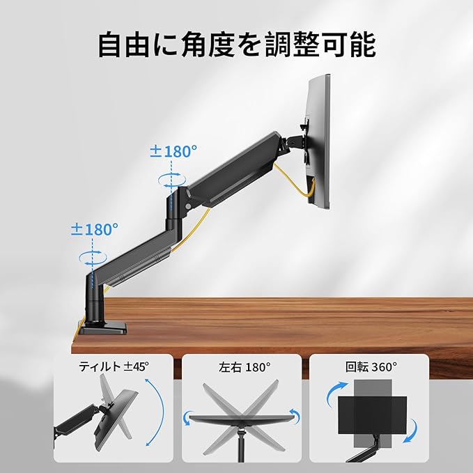 【快適な視野と広範囲な調整】このデスク モニターアームは、モニターを 45 傾斜、 90 左右、360 回転、高さ調整が可能です。より快適な環境で作業、ゲーム、動画視聴をお楽しみいただけます。