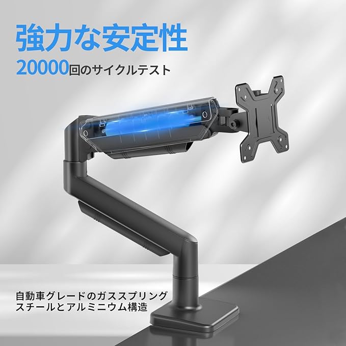 【モニターアーム ガススプリング式】モニターを1画面設置できるガススプリング式ディスプレイアームです。2万回テスト済みのガススプリングシステムを搭載したモニターマウントは、耐久性に優れています。モニターアームは最適な調整が可能で、姿勢を良くします。ご使用前にモニターの重量に合わせて調整してください。