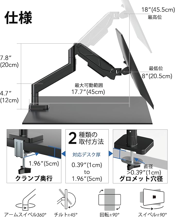 無段階調整で快適な作業環境を実現:360 回転、 90 スイベル、-45 〜+45 のチルト調整が可能。理想的な視野角を実現することで目・首・背中への負担を軽減し、長時間の作業でも快適な姿勢を維持できます。