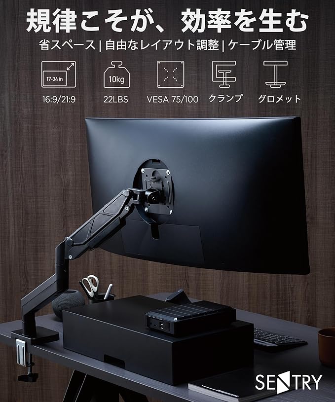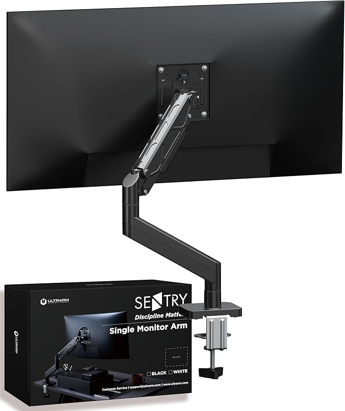 ULTRARM シングルモニターアーム デスクマウント ガススプリング式 VESAスタンド 13"-34"対応 クランプ & グロメット固定 高さ調整可能 耐荷重10kg VESA 75/100mm Sentry 黒 MA10E-S