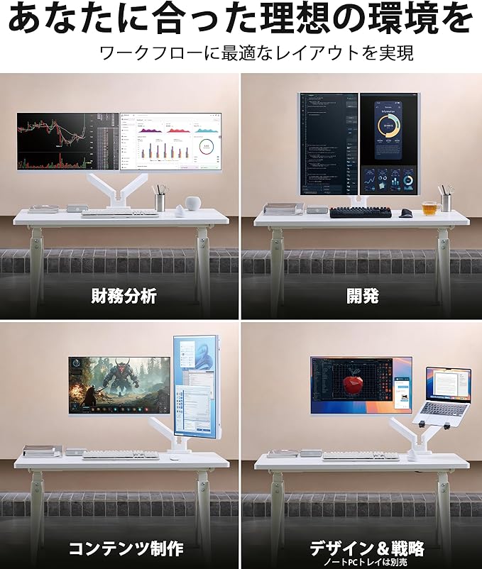 配線の乱れを解消 – スマートなケーブル管理:内蔵ケーブルマネジメント機能により、配線をアーム内部に収納。デスク周りをすっきりと保ち、プロフェッショナルな環境を演出します。