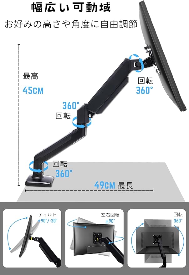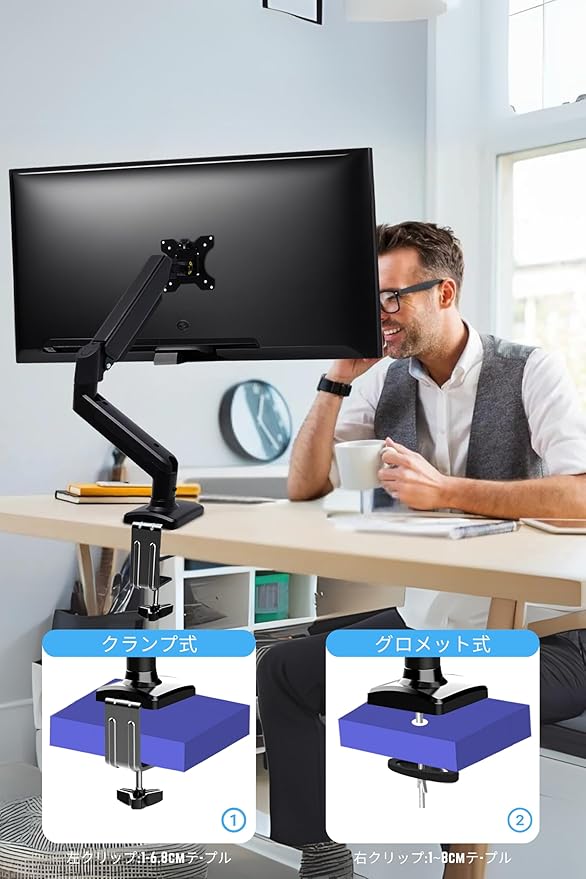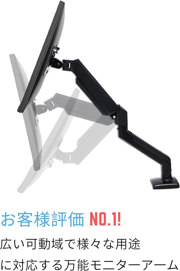 モニター アーム デスクマウント ディスプレイ アーム 1画面 シングル VESAアーム クランプ式&グロメット式 PCモニターアーム ガススプリング式 13~32インチ対応 耐荷重12kg 多角度調節 ケーブル管理