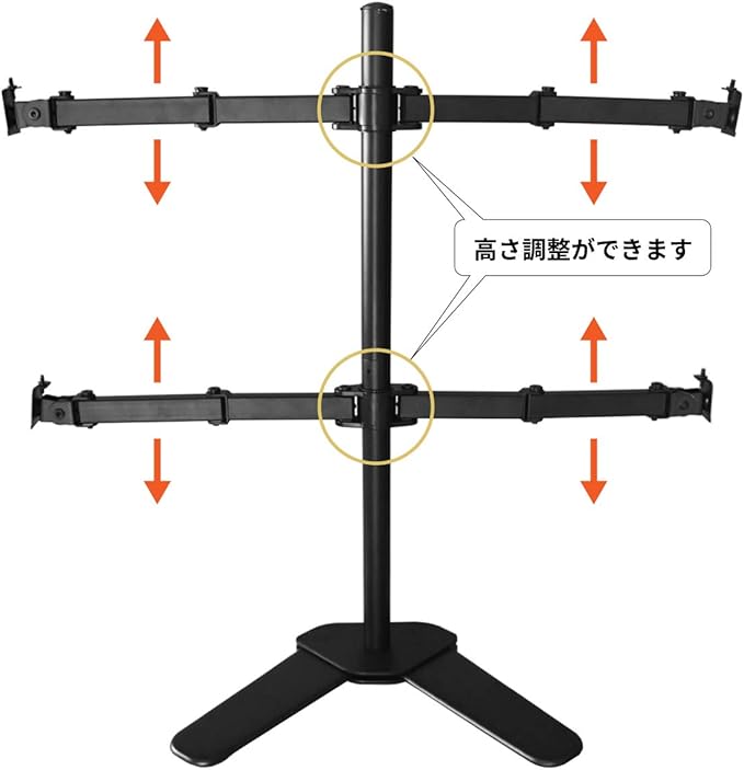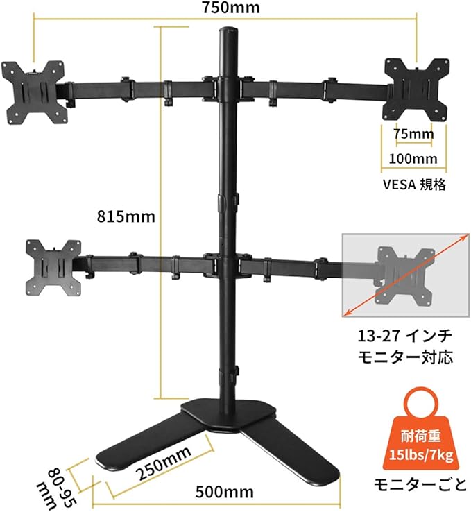 対応モニター数4台 対応モニタサイズ13〜27インチ液晶モニタ VESA規格対応(ネジ穴距離)75 75mm, 100 100mm 支柱径40mm 耐荷重各アーム7kg 支柱高さ815mm 材質スチール アーム長さ750mm カラーブラック 上下調整角度+/-90度 塗装粉体塗装 左右調整角度+/-90度