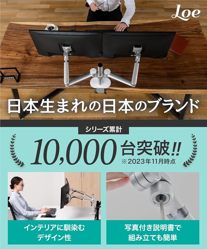 LOE(ロエ) デュアル モニター アーム ディスプレイ ノートPC 2画面 スタンド デスクマウント ダブルクランプ LOL2 白 x シルバー