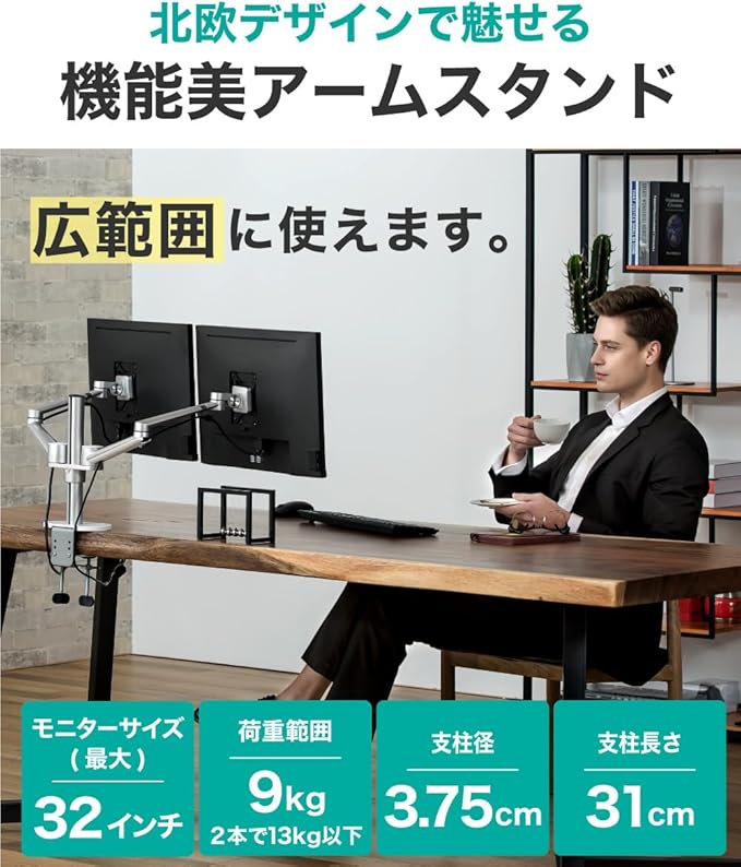 流行に左右されないタイムレス・ロングライフといった北欧デザインの考えに影響を受けたデュアルアームモニタースタンドが新登場。 おしゃれで温かみのあるデザインは、あなたの暮らしの中のデスク空間を快適にします。