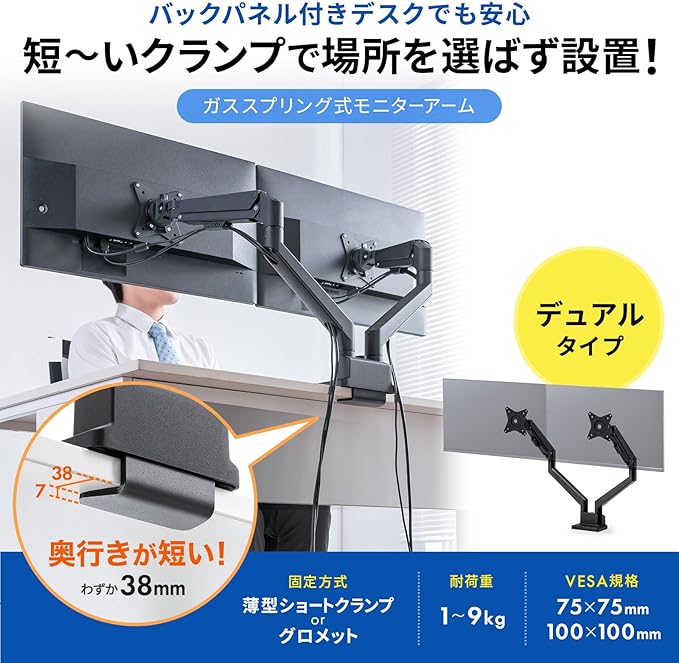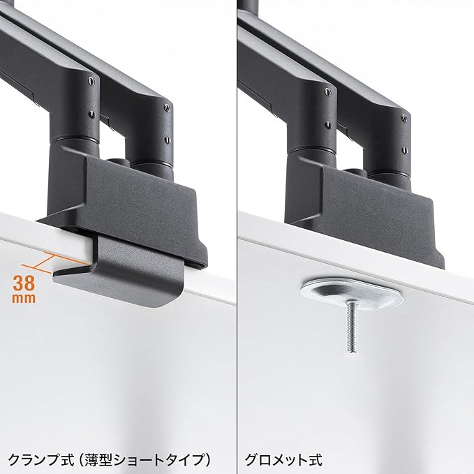 ●クランプ金具の奥行きがわずか38mmの薄型ショートクランプタイプなので、バックパネルのあるデスクにも取り付けしやすくなっています。