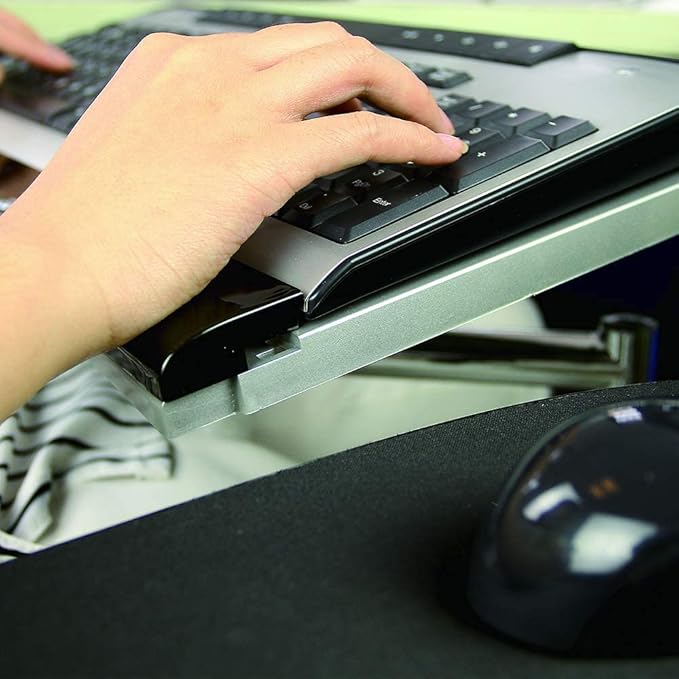 キーボードの角度は自由に調整でき: 人間工学に基づいた左右の回転、角度調整、スライドキーボードを発生さデスクキーボードトレイ完璧な位置にすることができます。デスク下高さ&角度調整可能キーボードホルダーW /負のティルトブラケットが折りたたまれて開かれキーボードが脱落して滑り落ちるのを防ぎます