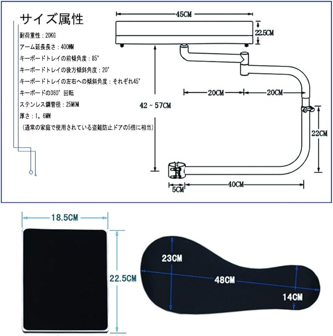 製品の特徴はじめに:耐荷重: 20KG アーム延長長さ:400MM、キーボードトレイ前方傾斜角度:85 キーボードトレイ後方傾斜角度:20 、キーボードトレイ傾斜左から右角度:各45 、キーボード回転360 ステンレス鋼管 直径:25MM、厚さ:1.6MM(通常の家庭で使用される盗難防止ドアの5倍に相当)