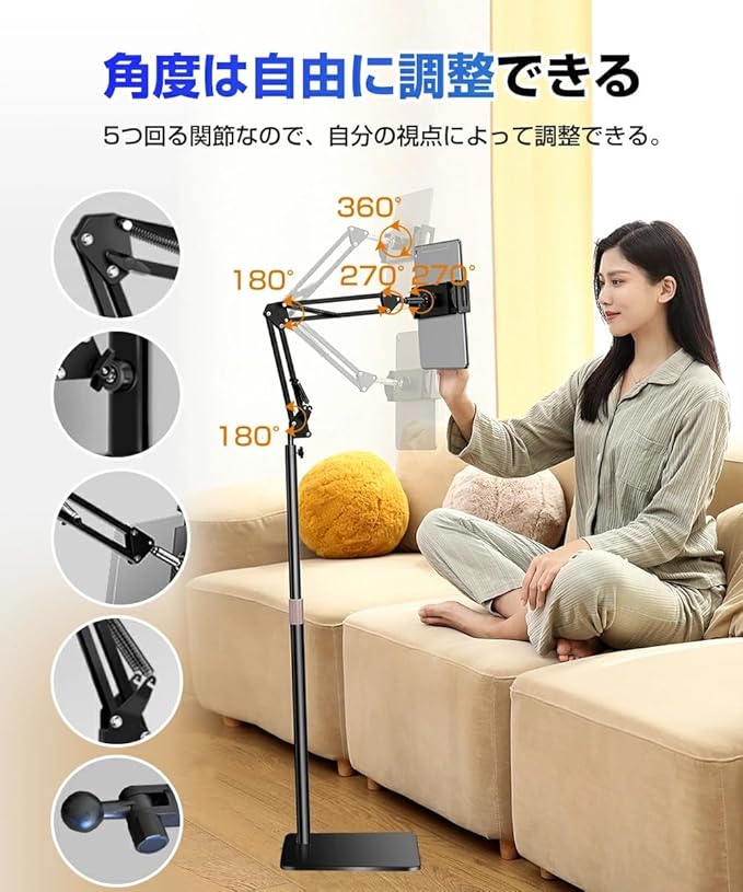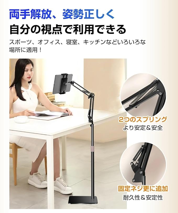 タブレットスタンド タブレットフロアスタンドは、4~12.9インチのタブレットやスマホに幅広く対応し、あらゆるシーンで快適に使用できる設計が特徴です。全金属製の本体は高品質なアルミ合金と炭素鋼を使用しており、優れた耐久性と安定性を実現しました。台座部分には滑り止めのスポンジマットが付いており、床やデバイスを傷つける心配がありません。さらに、最大1.5kgまでの荷重に対応しているため、大型タブレットでも安心して使用できます。 このスタンドは、360度回転可能なボールジョイントとフレキシブルなアームを採用しており、高さや角度を自由に調整できます。リビング、寝室、キッチン、オフィスなど、どのような環境でも快適な視聴体験を提供します。特に動画視聴やオンライン学習、料理中のレシピ確認、さらにはエクササイズ中のサポートなど、多用途に活用できる点が魅力です。また、折り畳み可能なデザインで、収納や持ち運びも簡単に行えます。 本商品は、使用する際に両手を解放できるため、手軽さと快適さを追求したい方に最適です。高さ調節可能な支柱は、身長や用途に合わせて調整可能で、自撮りや生配信にもピッタリです。タブレットやスマホを縦向き、横向きのどちらでも安定して設置できるため、操作性も抜群です。対応機種はiPadシリーズやiPhone、Androidデバイス、Kindle、Nintendo Switchなど多岐にわたり、家族全員で便利に使えます。 1年保証が付属しており、購入後の安心サポートも充実。不良品やご不満がある場合には、迅速な返品・返金対応を行います。このタブレットスタンドは、高機能性と洗練されたデザインを兼ね備えたアイテムで、日常生活をより快適で便利にするお手伝いをします。