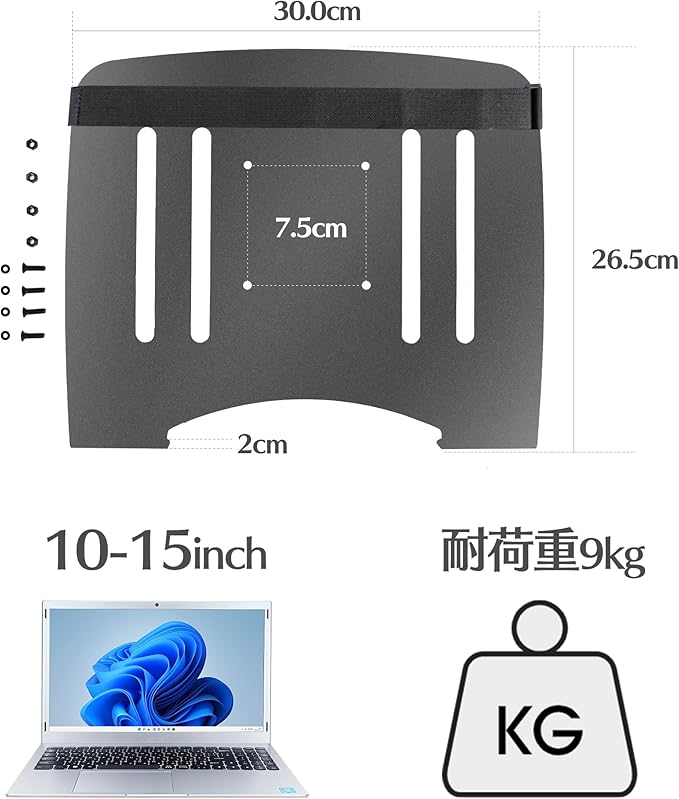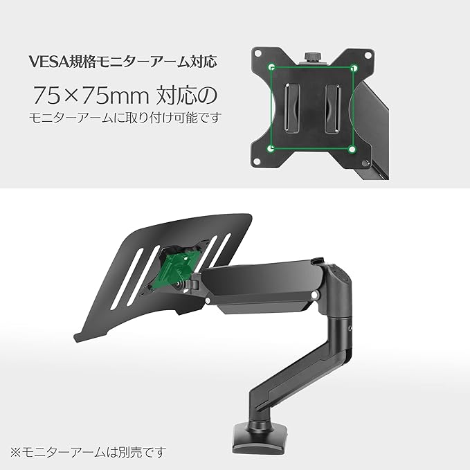 【商品仕様】本製品はモニターアームにノートPCを固定するために開発されたトレイです。VESA規格:75 75mm。 耐荷重:9kg。 対応ノートPC:10~15インチ。ご注意:調節範囲はアームに依存するため、各アームによって調節範囲が異なりますので、あらかじめご了承ください