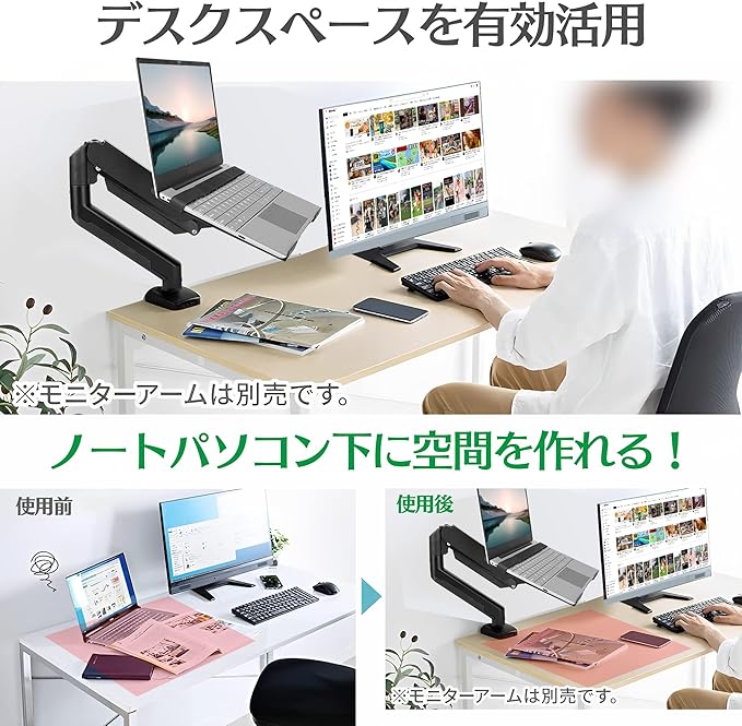【上下左右移動可能クランプ】 優れたばね式クランプで、10-15インチのパソコンやタブレットをモニターアームに装着して、高さと角度を自由に調整できます