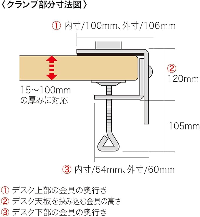 ●デスクへの取付けはクランプ式になっており、厚さ15~100mmの天板に取付けることができます。
