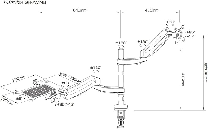 対応サイズ ディスプレイ 10~27インチ ノートpc 10.1~17.3インチ w 292~430mm d 10~20mm h 50~270mm