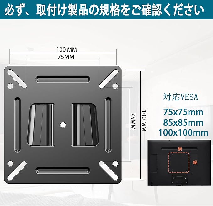 【幅広く対応-テレビ壁掛け】VESA規格(テレビ背面のネジ穴の間隔):幅75~100mm 、高さ75~100mm。テレビ用ブラケットはVESA75X75mm、100X75mm、100X100mm。