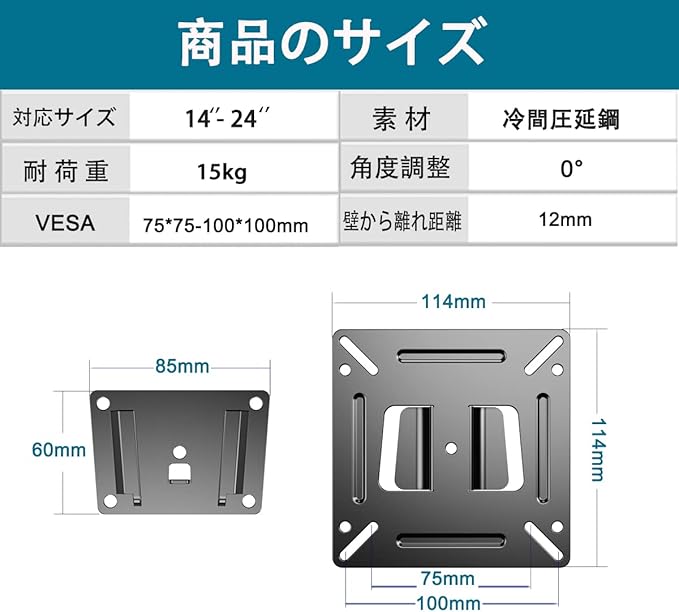 TETVIK テレビ 壁掛け金具14~24インチ液晶テレビ・PCモニター用 薄型固定式ビス付き 対応VESA規格100X100mm 耐荷重15KG モニター かべかけ 金具