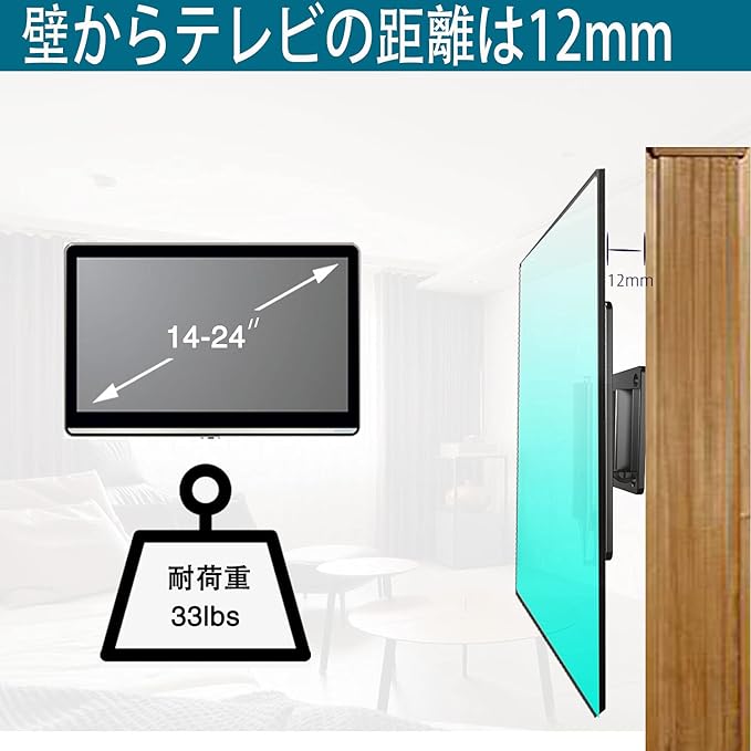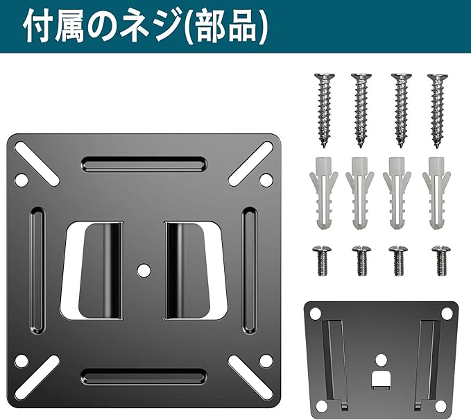 【取付簡単】シンプルな構造なので、壁とテレビに各金具を取り付け、テレビ背面に取り付けたマウントな具を壁用金具にスライドさせて取り付けるだけ。 壁からテレビの距離は約12mmと圧迫感もなく、取付必要な部品が揃っていて、取付は簡単です。