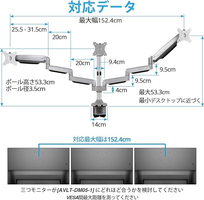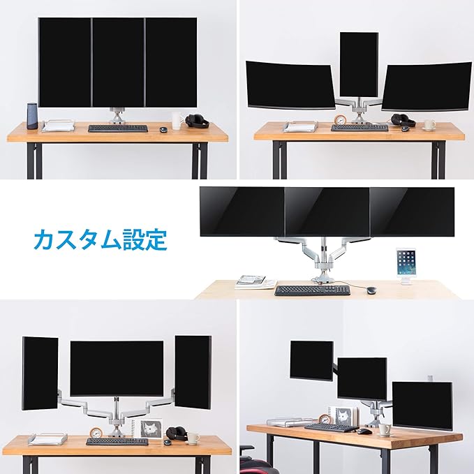 AVLT モニターアーム トリプル 3画面 13~32インチ対応 耐荷重1~7kg ガススプリング式 多角度調整 VESA クランプ式&グロメット式 ディスプレイスタンド フラット/曲面モニター対応