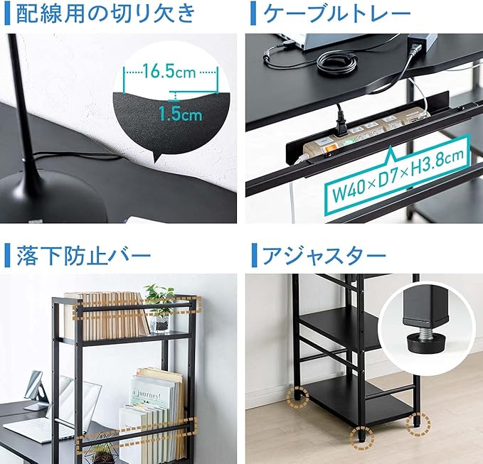 電源タップやケーブルを収納できるケーブルトレーが天板下に付いています。シェルフ部分には、棚から物が落下しないための落下防止バーが付いています。デスクのガタつきを防ぐアジャスターが各脚に付いています。