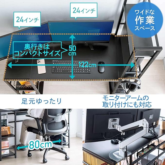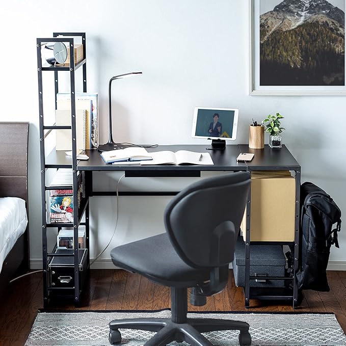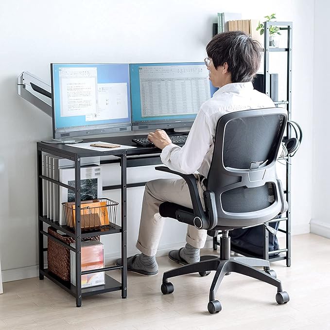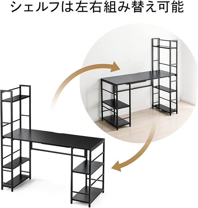 サンワダイレクト パソコンデスク 収納ラック付 幅122 奥行50cm モニターアーム取付対応 ラック左右組み替え可能 ブラック 100-DESKH043BK