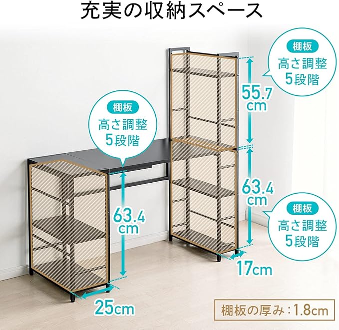 1台のデスクを家族内でシェアしたり、勉強机や作業台としての使用に最適です。シェルフの収納部分の棚板は高さ調整が可能です。