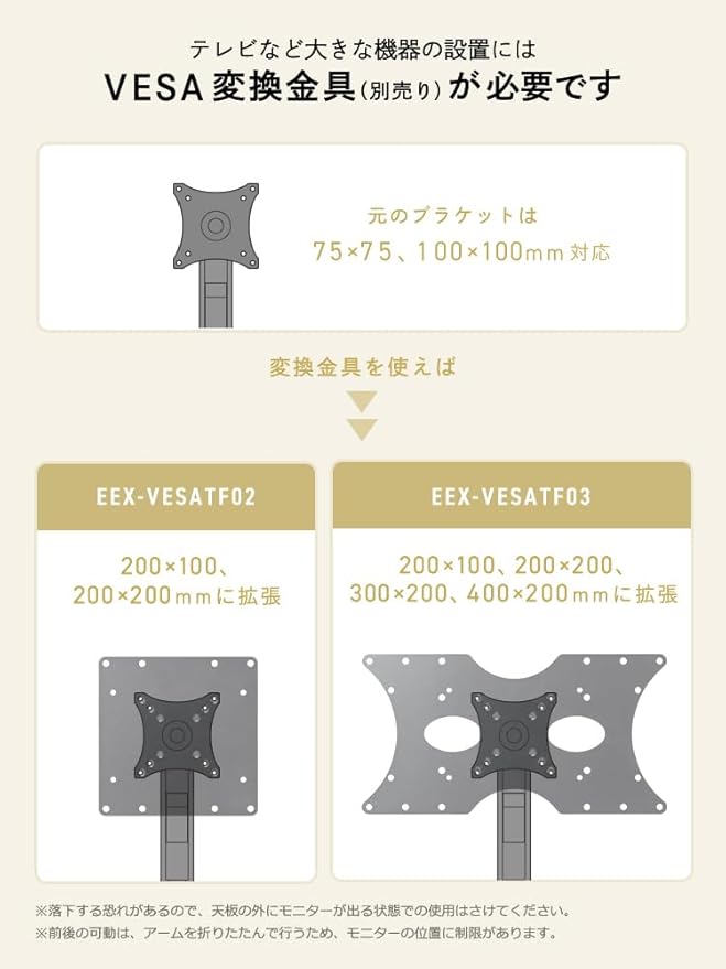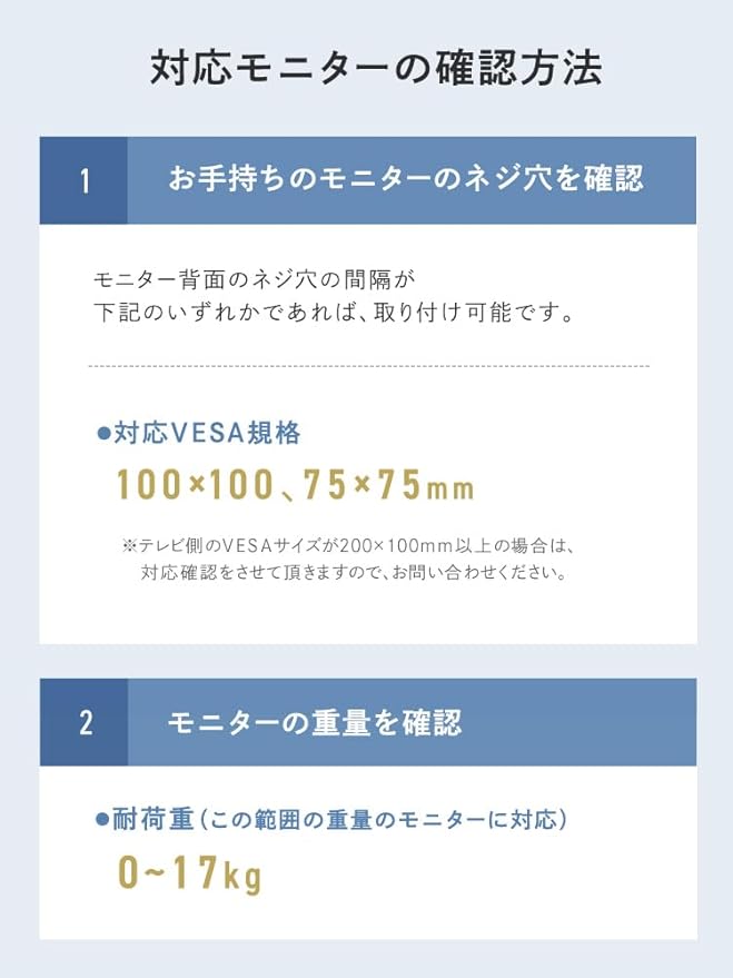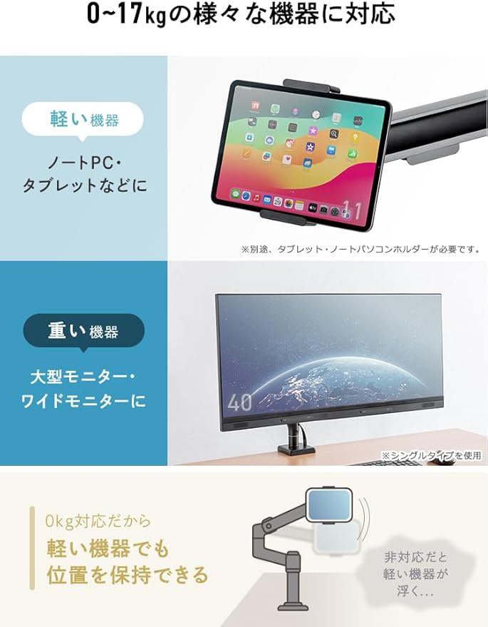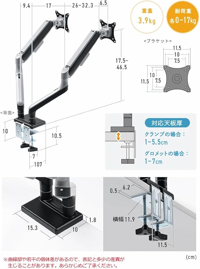 ★モニターの耐荷重:0~17kg(1アームあたり) ★対応VESA:75 75、100 100mm (※大型テレビは別途販売の「VESA変換金具」で200mmや400mmに拡張できます) ★対応する天板の厚み:1~5.5cm ※湾曲モニターはその構造上、平面モニターに比べモニターアームに負荷がかかりやすいため、耐荷重に余裕のあるモニターアームをお選びください。