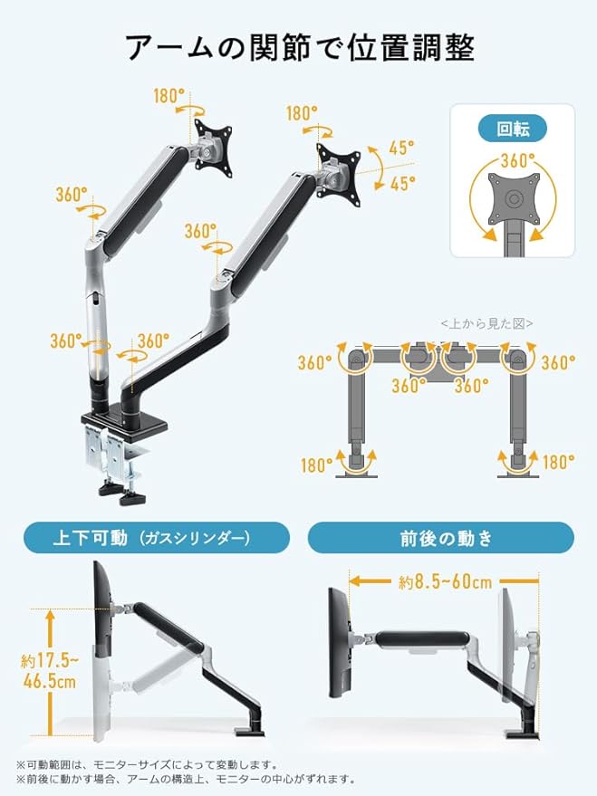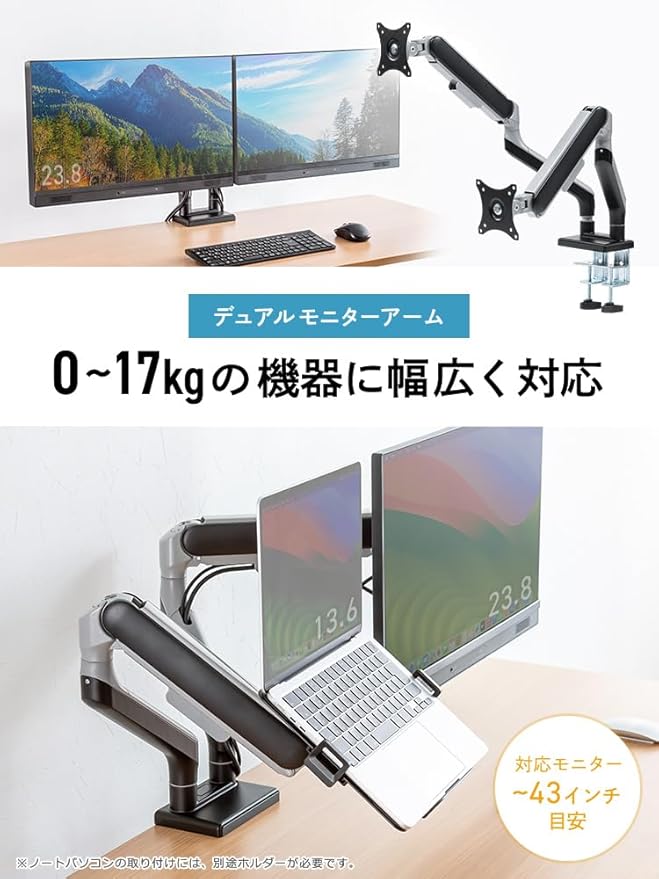 【耐荷重0~17kg!】大型のモニターからタブレットまで、幅広い機器に対応。作業空間を自由自在に!デュアルモニターアームで、あなたのパフォーマンスを最大限に引き出そう!