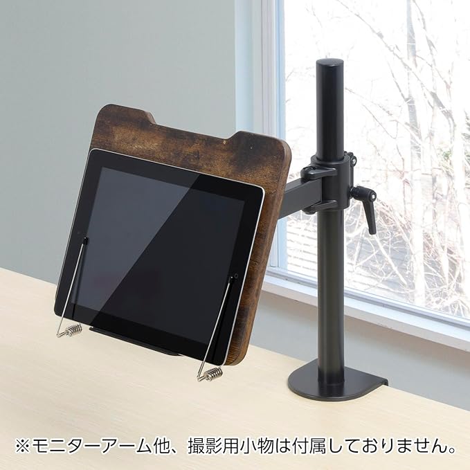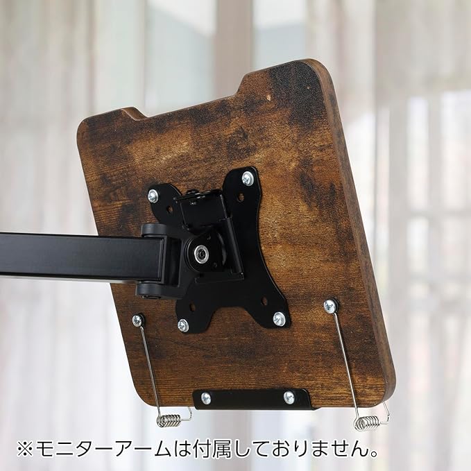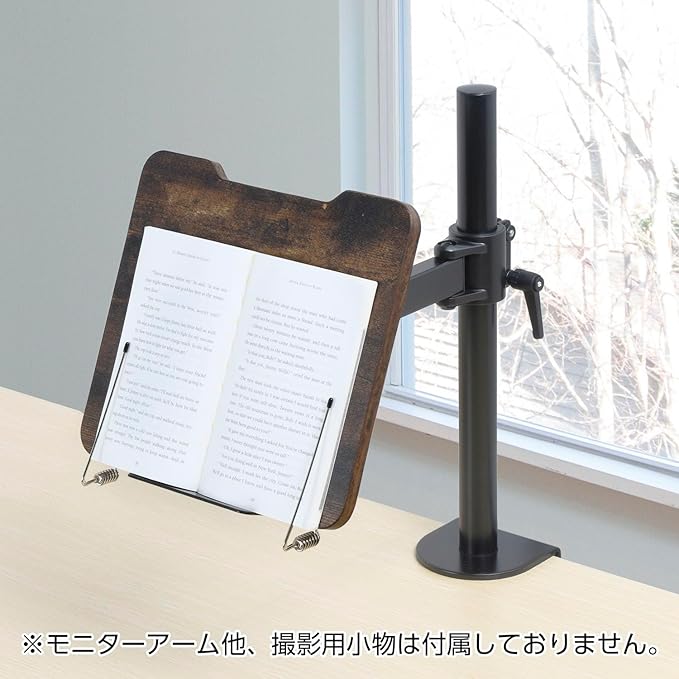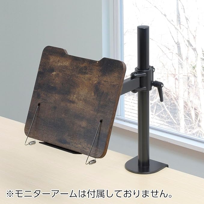 モニターアーム環境にシン・提案! 深い木目調と黒色のコンビでヴィンテージ空間を演出。 ■モニターアームへ本やタブレットなどが設置可能になる木目調ホルダー。 ■雑誌や本、タブレットを好みの角度、位置に固定できます。 ■置いた本やデバイスを2つのクリップが押さえ、ページのめくれや横すべりを軽減。 ■VESA100対応したモニターアームであれば取り付け可能です。 ※モニターアームの耐荷重の範囲内でご使用ください。