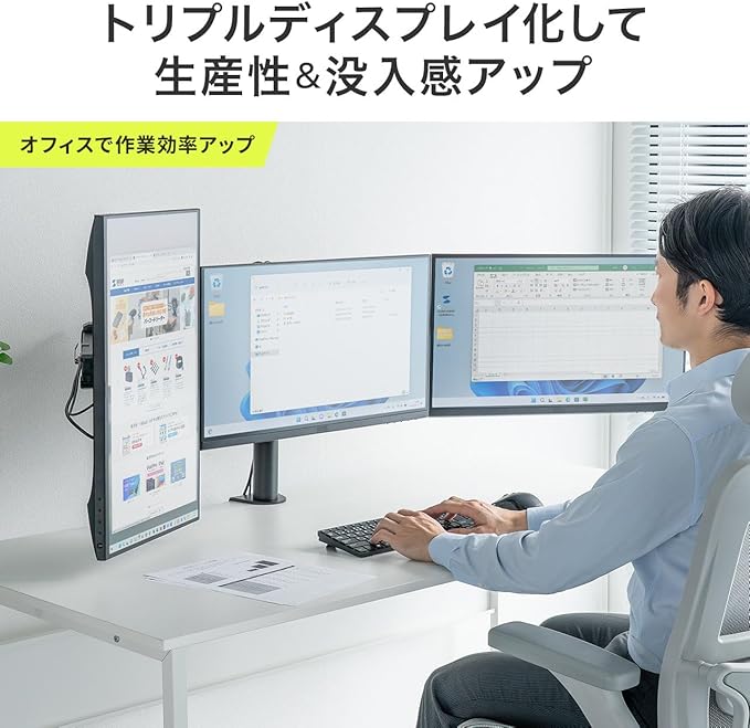 横並びで3つのディスプレイを並べて設置できるので、作業効率が格段に上がります。