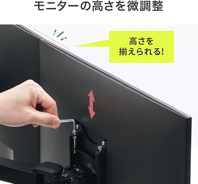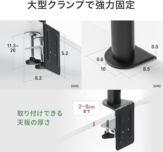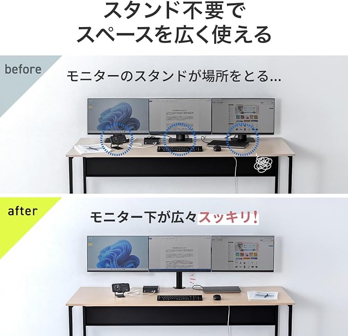 最大10kg(モニター1台あたり)までの液晶モニタの取り付けに対応しています。液晶アームを使うことで、モニタの台座を必要としない分広々とデスク上を使用できます。