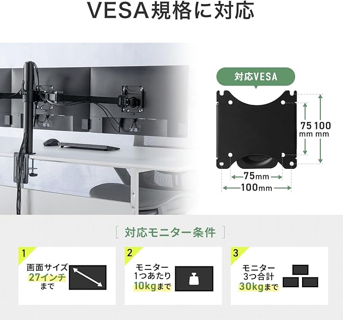 VESA規格(75 75mm、100 100mm)に準拠した液晶ディスプレイの取り付けが可能です。