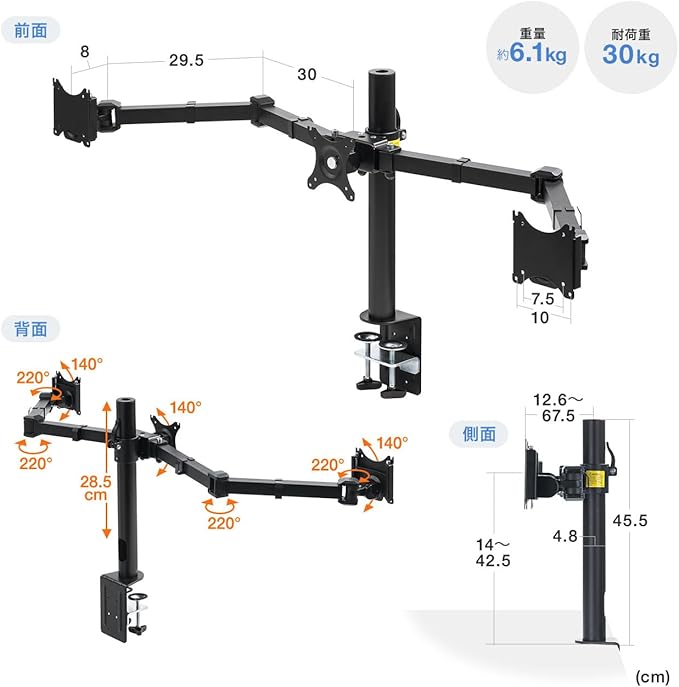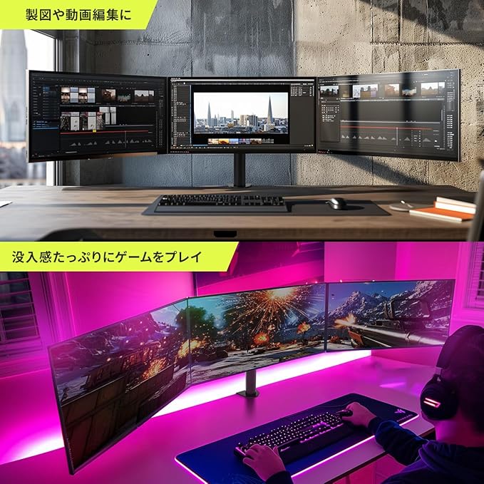 3台のモニターを横並びに設置できるモニターアームです。