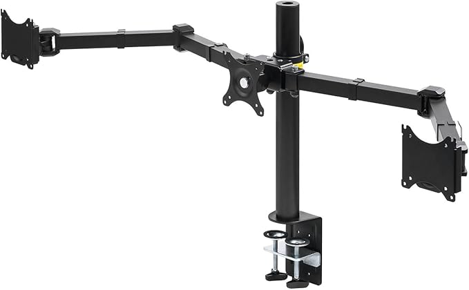 3画面のマルチ画面に最適なディスプレイアーム。同じ高さに調整でき、3画面を横並びにできるモニターアーム。クランプでしっかり固定。27インチまで対応。