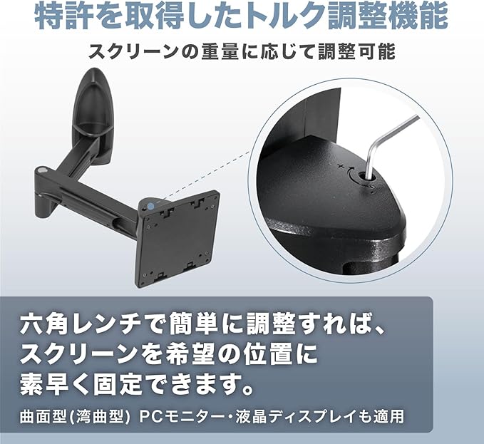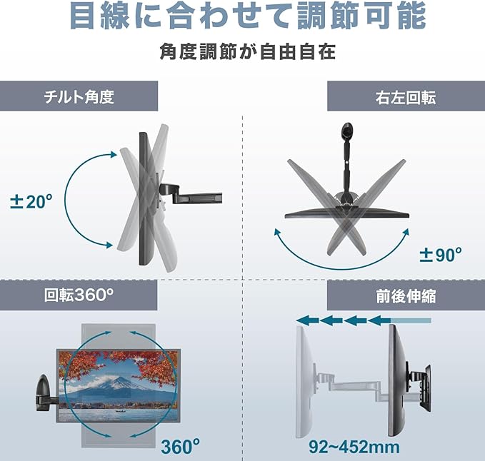 【自由調整】特許を取得したトルク調整機能で、テレビのサイズや重量によって、簡単に調整することができます。●チルト角度(上向き20 /下向き20 )●横か縦(ピボット回転機能:360 )● 左右90度を調節できて、自分のニーズに合わせて、最適な角度と距離を自由に調整できます。