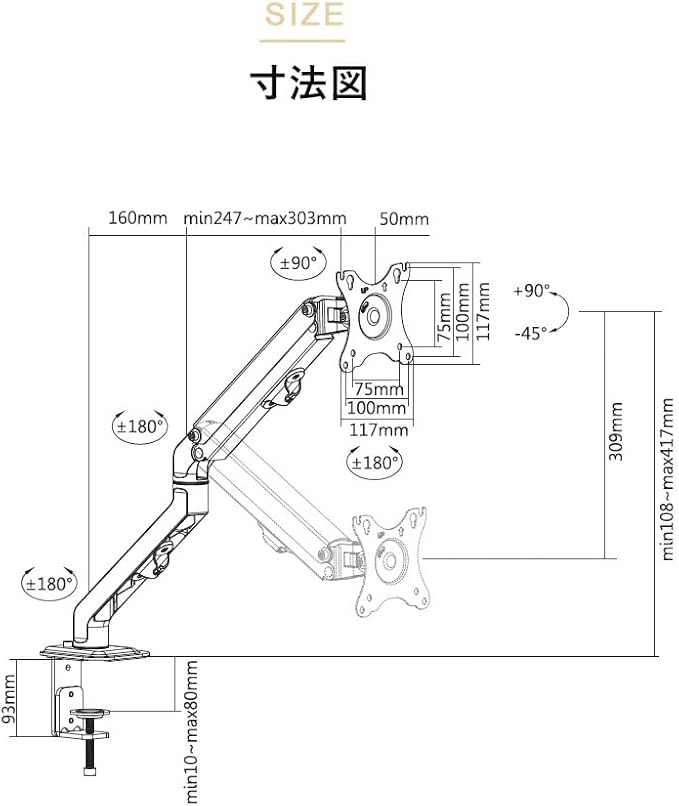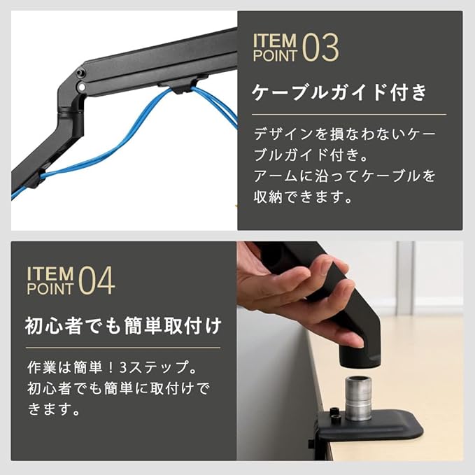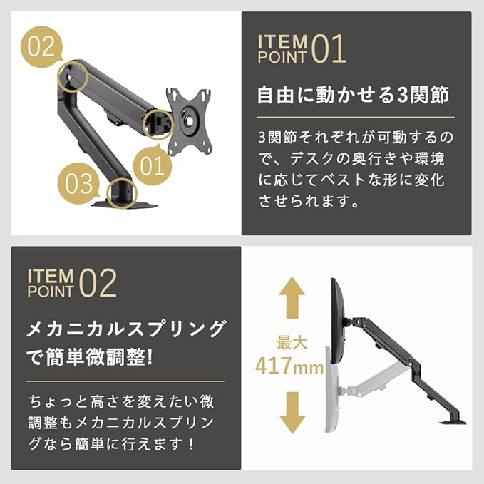 【メカニカルスプリング式アーム】機械式のバネで上下の昇降を調整するモニターアームです。ガス式に比べると調整時に力を必要としますが 金具自体の耐久性に優れています。コストパフォーマンス重視で初めてのモニターアームの方にオススメです。