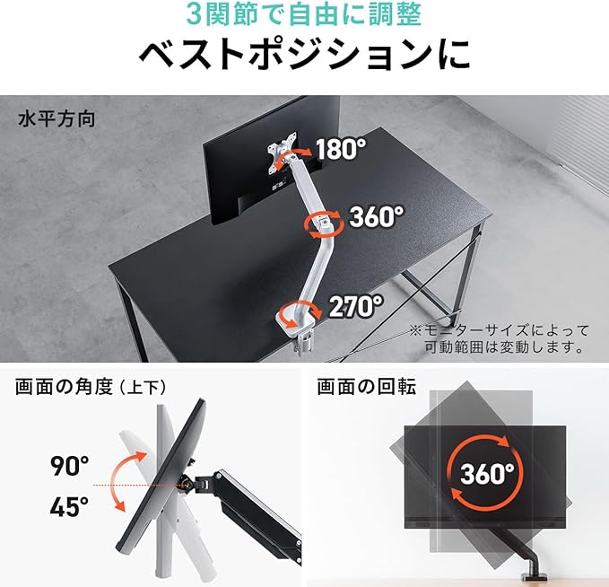※モニターの重量によってアームの動きの固さは異なります。
