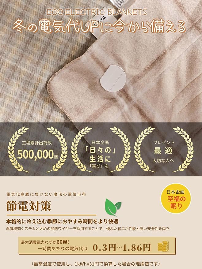 『日本企画・究極の温かさがここに、従来の電気敷き毛布の概念を超える即効暖かさ║節電対策No.1 ・ 想像ふくらむ冬の新作』 Topzeeが追求したのは、フィット感と科学が融合した画期的な温もり。 ✓ 独自開発の"ヒーターマスター(Heat Master)"技術が双方向熱循環システムにより、驚くほど効率的なエネルギー変換を実現!電力はコントロール可能な灼熱の熱波へと変わり、毛布全体に持続的な暖かさをもたらします。 ✓ 最大消費電力はわずか60Wで、1時間当たりの電気代は0.3円~1.86円非常に経済的(電気料金目安31円/kWで算出)。世界的なエネルギー価格の高騰が続く中、「冬の暖房費」という課題にもしっかり応えます。高い省エネ性能と先進の技術を兼ね備えた本格派電気敷き。一日の終わりに、贅沢な眠りを「TOPZEEプレミアム電気毛布」で叶えましょう。美しさは、夜のあいだに