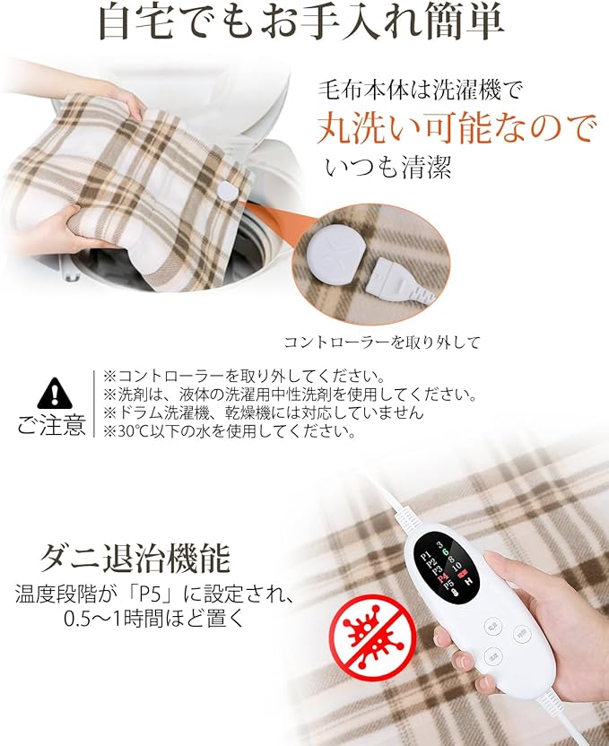 【洗濯機で丸洗いOK&ダニ退治】自宅で洗濯が簡単、コントローラーを取り外し、電気毛布を洗濯ネットに入れて、洗濯機で丸洗い可能。温度段階が「P5」に設定され、1~2時間ほど置いて、ダニを消滅でき、抗菌 除臭を実現します。しかも洗濯機で洗濯できるので、いつでも清潔にお使いいただけます。(※乾燥機には対応していません)