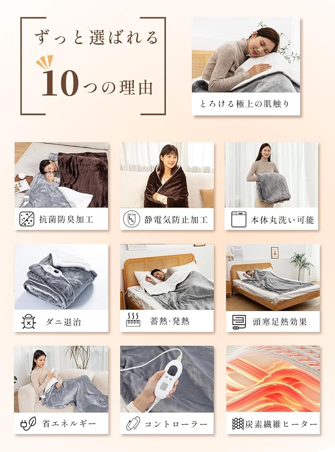【最新の炭素繊維発熱線】内部には最新技術の炭素繊維発熱線が採用されており、優れた耐熱性と効率的な熱伝導を実現しています。これにより、まるで日光浴をしているかのような、自然で心地よい温かさを体感できます。また、消費電力が抑えられているため、省エネ効果も期待できます。安全性も高く、寒い季節に安心して長時間使用できる電熱毛布です。