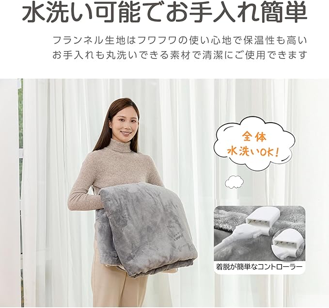 【水洗い可能でいつも清潔】本製品は、手軽に水洗いが可能です。洗濯の際は、電源コードを取り外すだけで、通常の毛布と同様に手軽にお手入れできます。洗濯後もフランネル素材の柔らかさが持続し、清潔な状態で長くお使いいただけます。清潔を保ちながら、冬の寒さ対策にもなる優れたアイテムです。