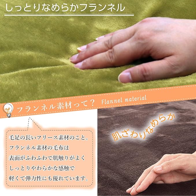 【ふわふわなさわり心地】なめらかな肌触りが特徴のフランネル毛布です。 この毛布は、敷き毛布としても掛け布団としてもお使いになれます。 フランネルはふんわりと柔らかい素材なので、電気を入れなくても触っているだけでぬくもりを感じます。