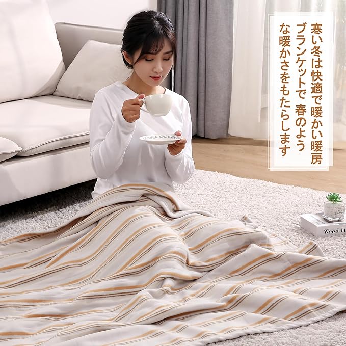 電気毛布 加熱ブランケット 130x160cm 4段階温度調節 10時間自動オフ機能付き 波状キャメル色 オフィス・家庭用