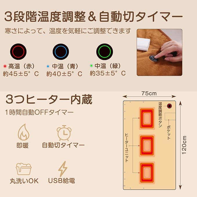 【3枚ヒーター内蔵&3段階温度調整&安心自動切タイマー】温度調節機能を搭載し、低温モード:30~35 C、中温モード:35~40 C、高温モード:40~45 Cの3段階があり(個体差 5℃)、寒さによって、温度を気軽にご調整でき、寒い冬に手足や身体を温めてくれ、暖かさをもたらします。じんわり温まるので熱くなりすぎることもなく、お子さんやお年寄りでも安心して使用できます。また、消し忘れの心配がない切タイマー機能付いています。電源投入後、1時間経過すると自動的に運転が停止します。外出中や睡眠の際には、電力の無駄遣いは一切ないです。