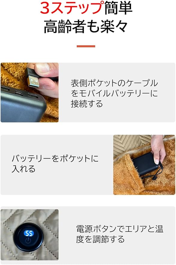 【USB給電式の電気毛布】電気毛布にUSBケーブルが付いています。電池(別売り)と接続して使用します。5 V/2 Aの電源仕様に対応しており、市場上の95%の電源に対応しています。モバイルバッテリー、コンピューター、カーチャージャー、AC充電器などに対応できます。※USB延長ケーブルが付属しており、使用もっと便利です。