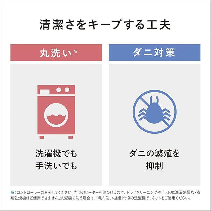 コントローラー部を外して丸洗いできる清潔仕様。さらに、生地の厚みは当社従来品の2.5倍 、約20 mm。毛玉ができにくい素材で、やさしくなめらかな肌触り。