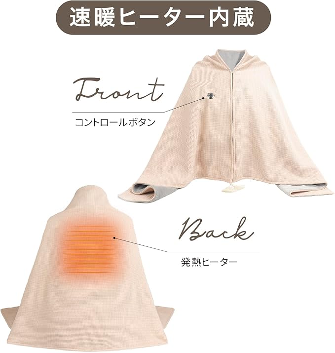 【ユニークなジッパーデザインで、ショール&ブランケットの2WAY使用】革新的なジッパーデザインにより、ジッパーを閉じれば肩や首元を温めるショールに、ジッパーを開ければ膝や腰を覆えるブランケットに早変わり。寒いオフィスや通勤中の防寒にも、自宅や旅行先でのリラックスタイムにも最適の着る電気毛布です