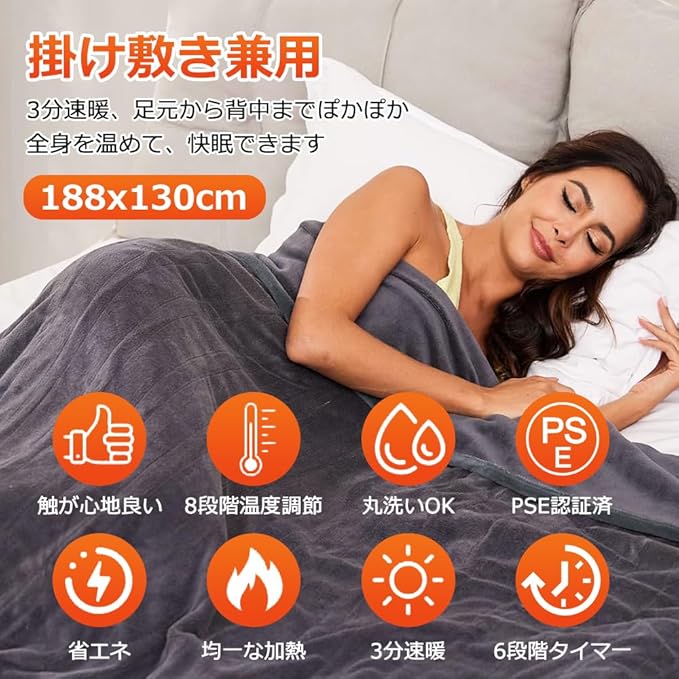【3分速暖&188x130cm大きめサイズ&掛け敷き兼用】:両面フランネル設計で、電気毛布はよりふわふわ、軽くて柔らかい肌触りになります。電源を入れてから約30秒は暖かく感じ、約3分ほどで徐々に全身まで温かくなります。全身を包み込んで朝まで暖かい188 130cmの大判サイズの電気毛布。この電気ブランケットがあれば、寒い日でもゆっくり過ごします。