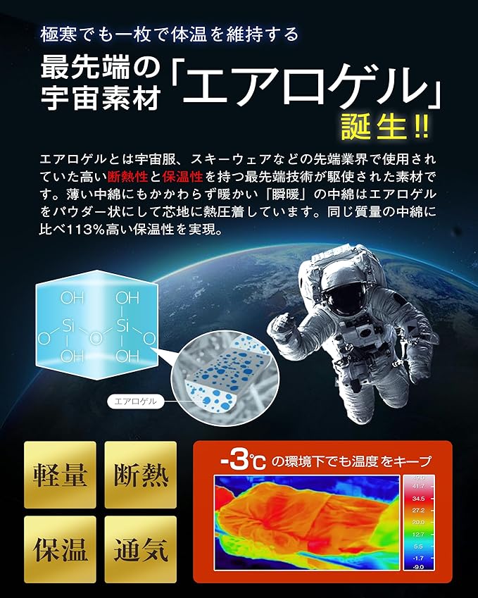 『2つの最先端テクノロジーで誕生、未来のあったか敷きパッド』「21世紀に革命を起こす素材」として知られる「エアロゲル」は、宇宙服にも使用されている圧倒的な「断熱性」「軽量性」「通気性」「柔軟性」「耐久性」を誇る素材です。また、「次世代の夢のような素材」と称されるコーヒーファイバーは、天然の「吸湿発熱」「蓄熱保温」「遠赤外発熱」「永久消臭」の特性を持ち、環境にもやさしい素材です。これら2つの最先端素材を冬用敷きパッドに使用し、究極の暖かさと快適さを実現しました。私たちにとっては小さな一歩かもしれませんが、寝具(敷きパッド)の世界にとっては大きな前進だと確信しています。ぜひ、"極みの一枚"を体験してみてください。